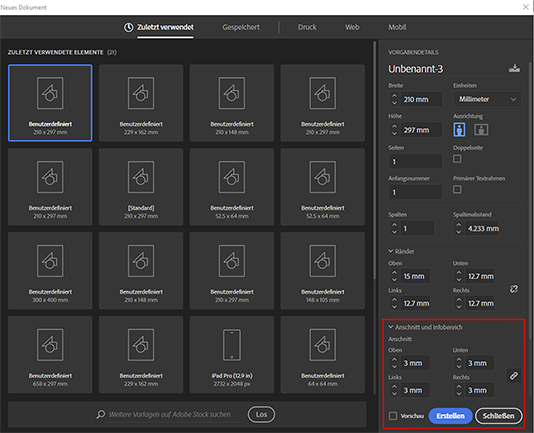 Beim Erstellen des Dokumentes kann der Anschnittbereich schon definiert werden. (Siehe Screenshot) Die Beschnittzugabe und die Schnittmarken werden beim PDF exportieren (⌘ + E/Ctrl + E) eingestellt. Wichtig hierbei ist es, dass das Dokument von Anfang an richtig aufgebaut wird.