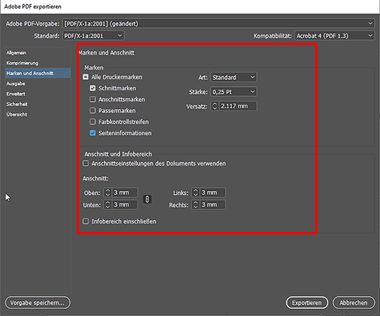 Die Datei kann unter «Indesign -> Datei -> Datei exportieren» exportiert werden. Danach muss ein Speicherplatz ausgewählt werden. Anschliessend erscheint das Export-Fenster. (Screenshot) In diesem Fenster sind links die verschieden Einstellungsmöglichkeiten aufgelistet. Die Beschnittzugabe und die Schnittmarken werden unter Marken und Anschnitt eingestellt. Das Häklein muss bei «Schnittzeichen» und «Anschnitteinstellungen des Dokuments» verwenden gesetzt werden. Wenn das gemacht ist, kann das Exportieren angeklickt werden und ist somit einsatzbereit.